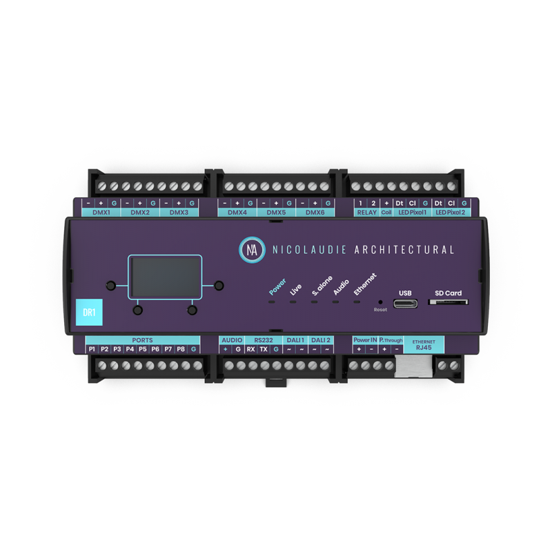 Dina-DR1-Lite 1024Ch, DIN Rail, Limited, ESA2, ESA PRO2, Arcolis DIN-Schiene, eigenständiger Lighting Controller. 1024 DMX -Kanäle Steuerung (auf 3072 aufgerüstbar). Dali, EDMX, LED -Pixelprotokolle in Option. Programmierbar über USB oder Ethernet mit ESA2- oder ESA Pro 2 -Software (Mac oder Windows). Kompatibel mit Android/iOS -mobilen Apps (Easy Remote Pro, LightPad, Arcolis). Geliefert mit einem USB -Typ C -Kabel. VORSICHT: 12V DIN RAIL NETRUNG VON OPTION
